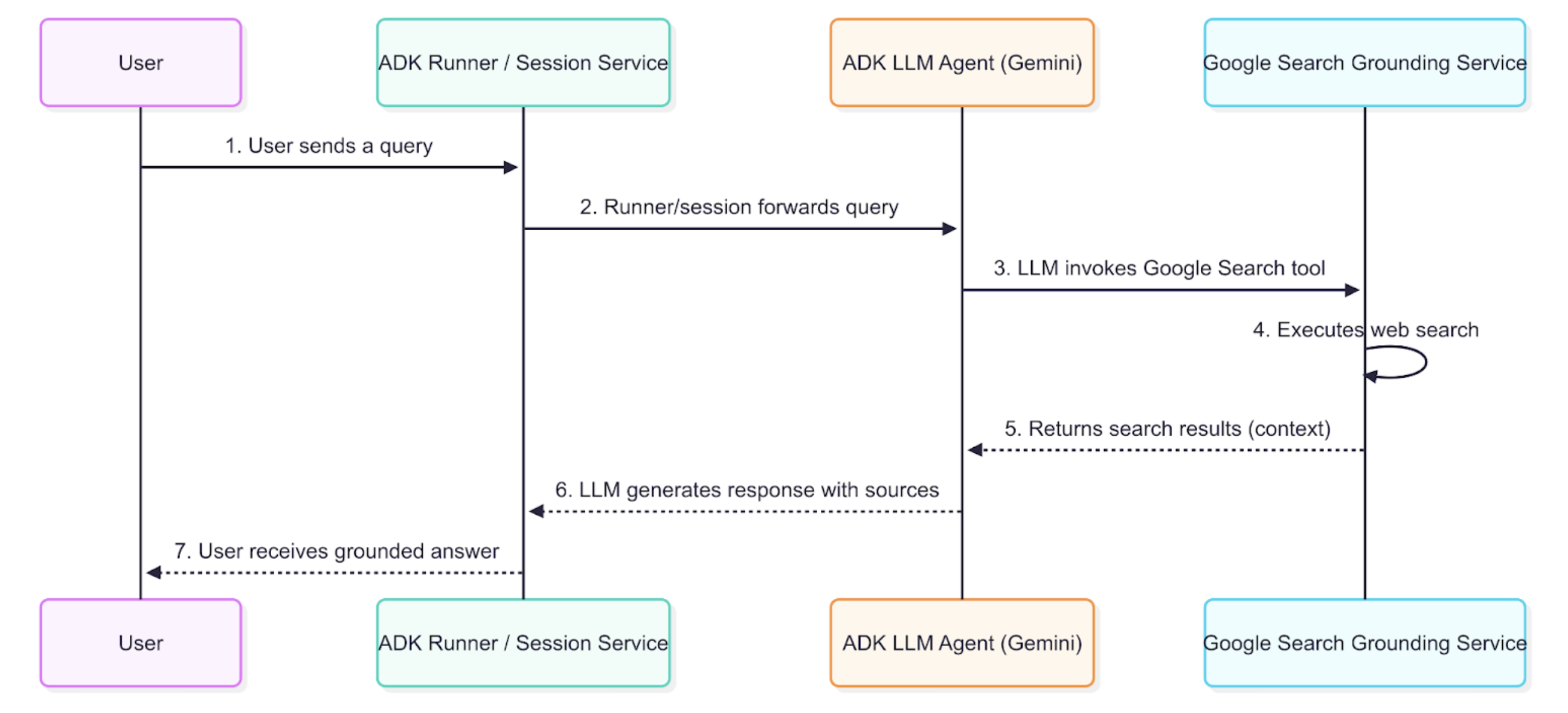 7. Response Presentation with Sources : The ADK receives the final grounded response, which includes the necessary source URLs and groundingMetadata, and presents it to the user with attribution. This allows end-users to verify the information and builds trust in the agent's answers.
